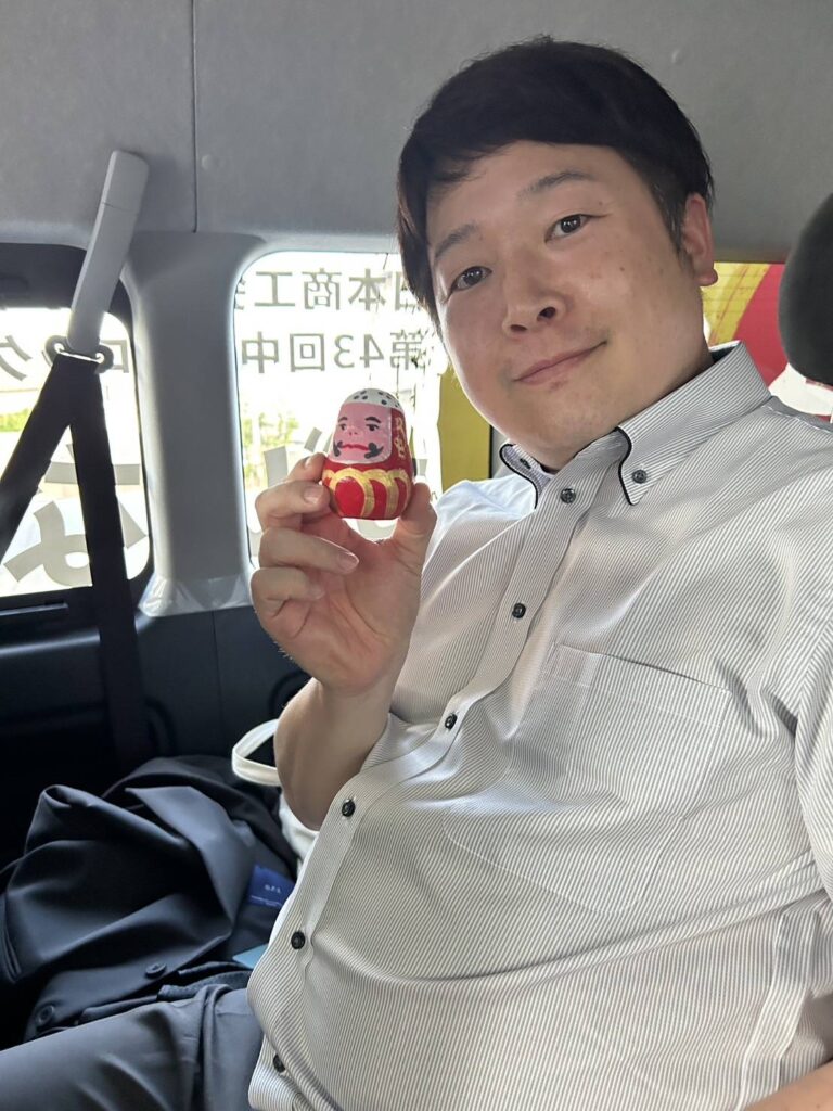 井上会長より大会バッチをいただき、三原YEGからは大会の成功とキャラバンの安全を祈念し、三原だるまを贈らせていただきました。