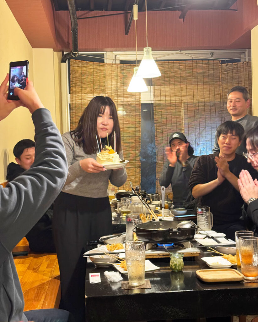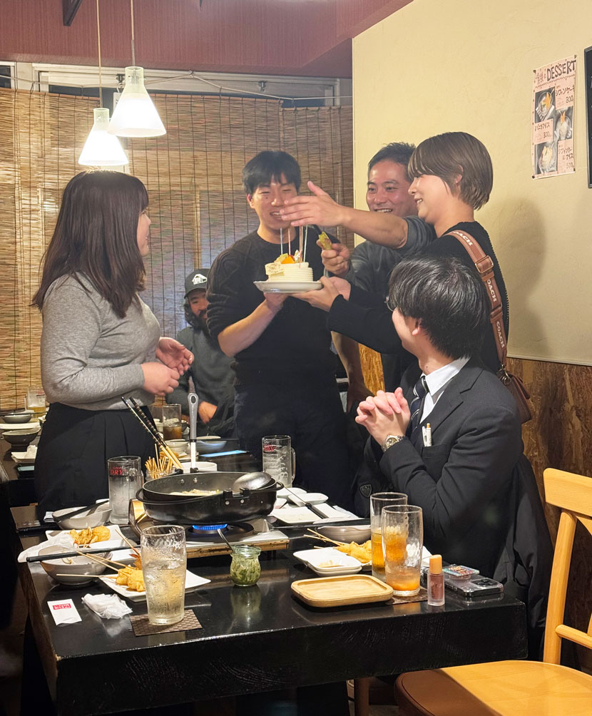 一次会は17名が参加。夏のBBQで好評だった「会員への質問コーナー」、この前日がバースデーだった平岡会長へ、大場会員よりお祝いと感謝の手紙朗読。バースデーケーキの登場もありました。